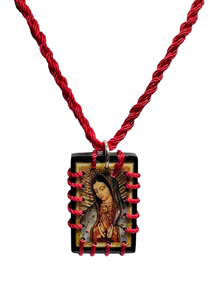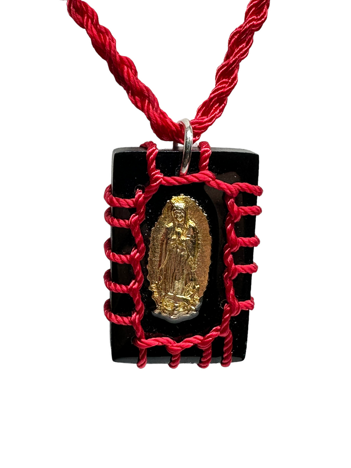 - Black color Wood pendant with Our Lady of Guadalupe image on one side and Gold Plated charm on opposite side