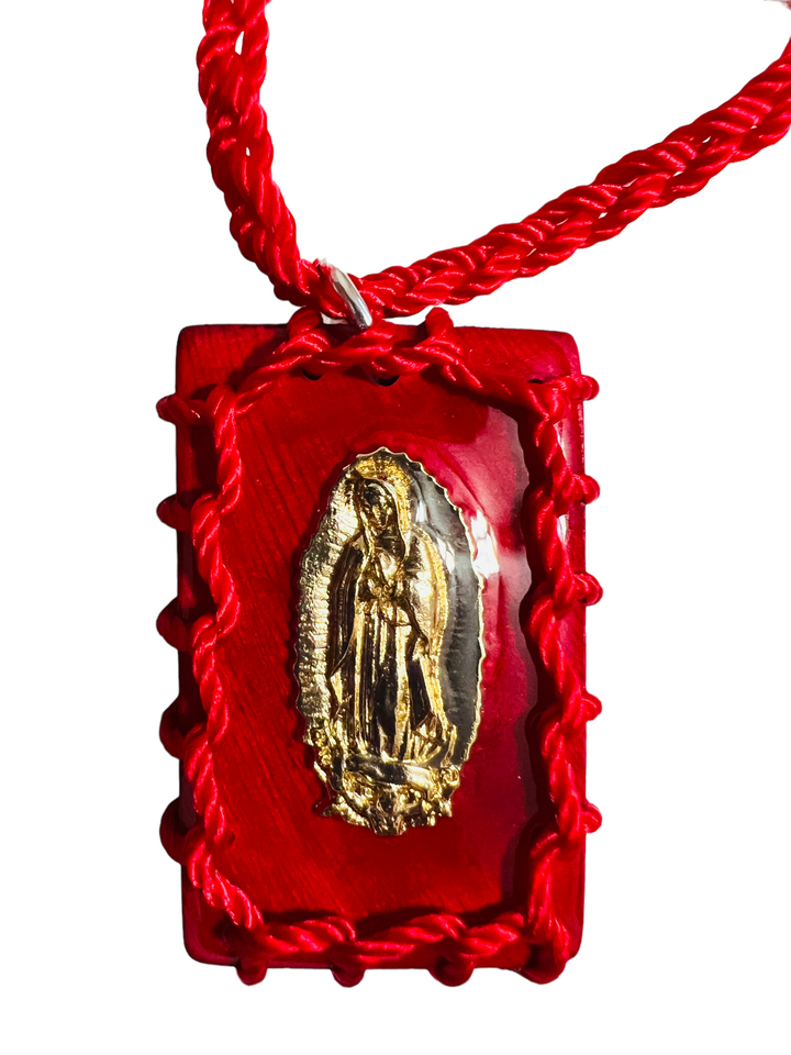 - Wood pendant with Our Lady of Guadalupe color image on one side and Gold Plated charm on opposite side