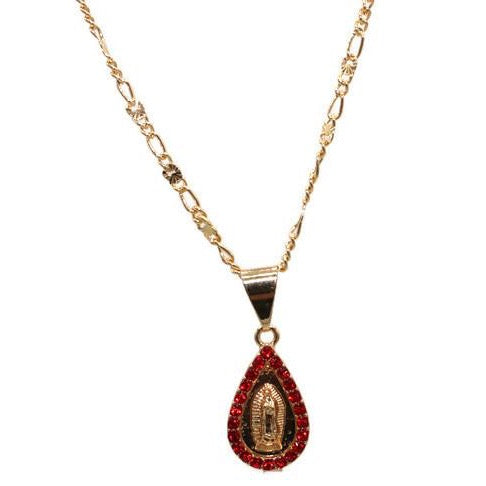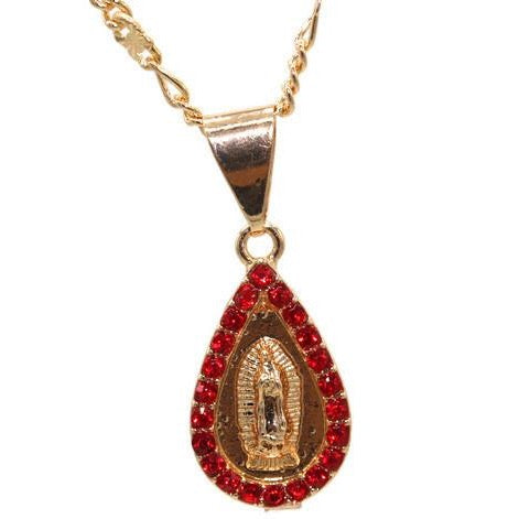 Our Lady of Guadalupe Tear Drop with Necklace Our Lady of Guadalupe Tear Drop Pendant - Red Stones Includes a 22" Necklace that is Gold Filled over Stainless Steel 24K Gold Filled Pendant...