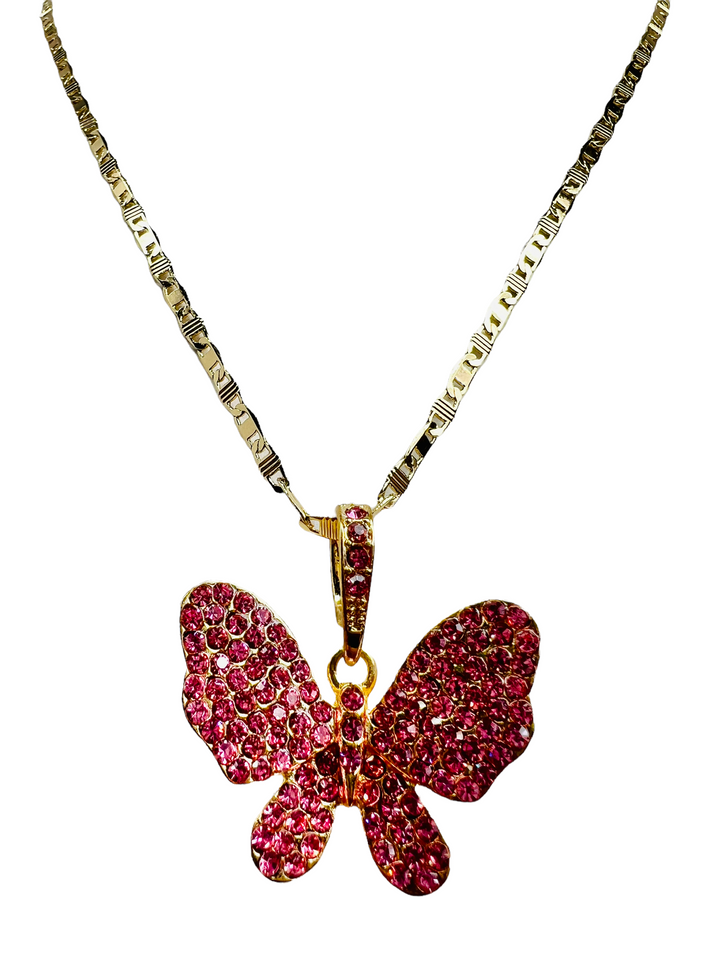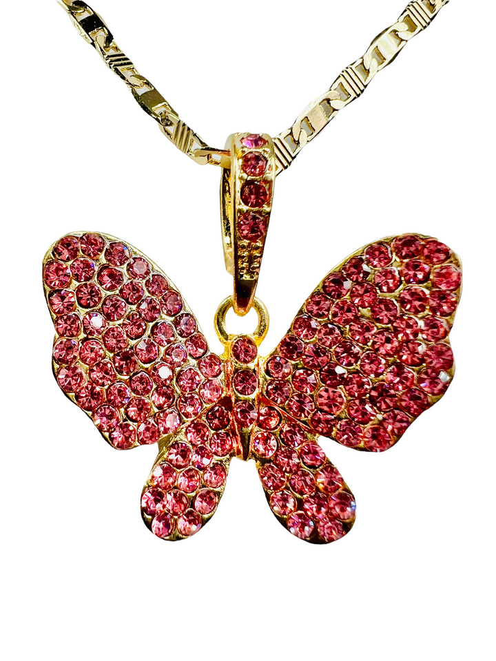Butterfly with Necklace Butterfly Pendant with Pink Stones Includes a 22" Necklace that is Gold Filled 24K Gold Filled Pendant Measures 33 mm Necklace Measures 22" Mariposa con Cadena Medalla de Mariposa con Piedras Rosa...
