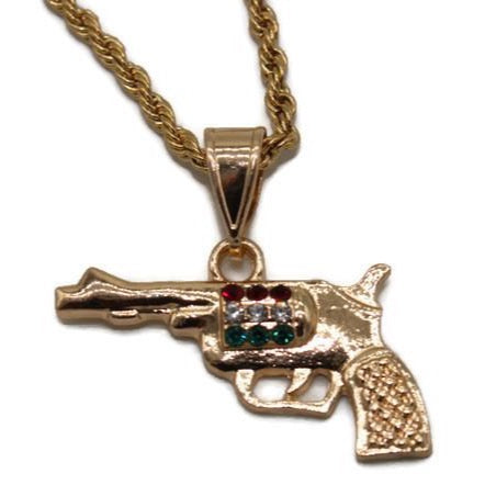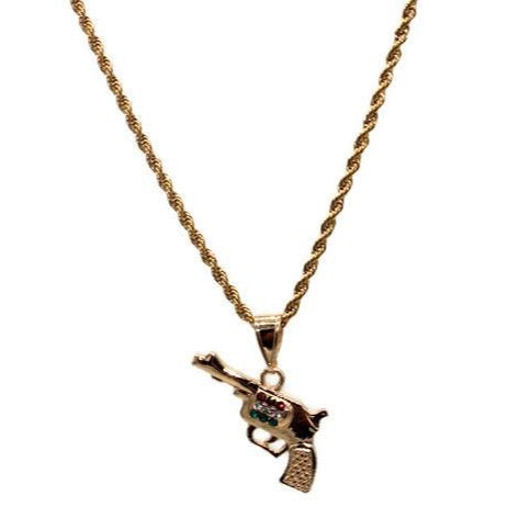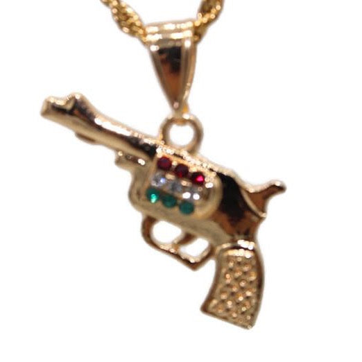 Revolver Gun Pendant with Necklace Revolver Gun Pendant - Has Mexican color Stones Necklace is 24K Gold Filled over Stainless Steel Pendant is 24K Gold Filled Pendant Measures 1 1/8" Necklace Measures 22"- 2mm ...