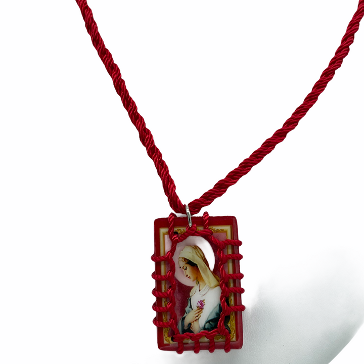 Mystical Rose Scapular Handmade Wood Pendant Red Color Made with Nylon Knotted Rope Adjustable Pendant has color image of the Mystical Rose on both sides Pendant measures 1 1/8" by 1 3/4" Escapulario...