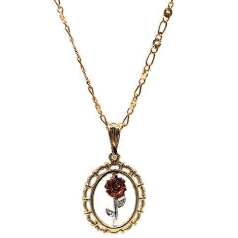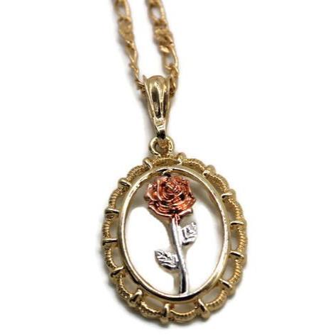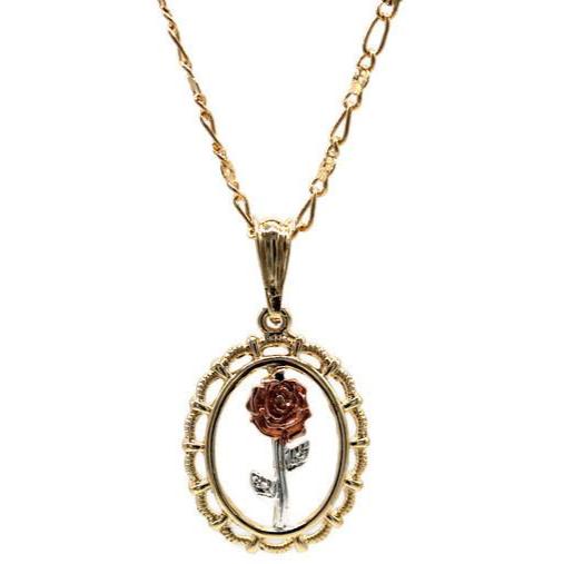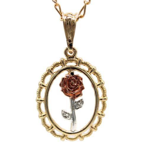 Rose Necklace Rose Pendant - Three Tone Includes a 24" Necklace that is Gold Filled 24K Gold Filled Pendant Measures 1 3/4" Necklace Measures 24" Rosa con Cadena Medalla de Rosa- Tres Tonos Incluye cadena...