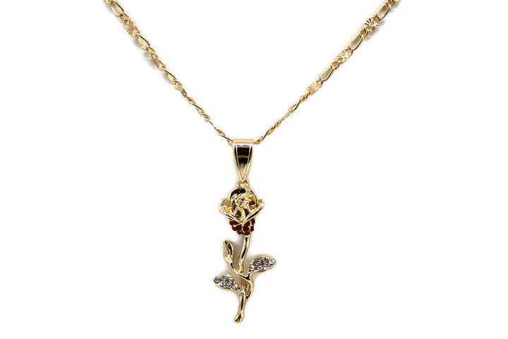 Rose w/ White and Red Rhinestones Pendant with Necklace (24K Gold Filled)