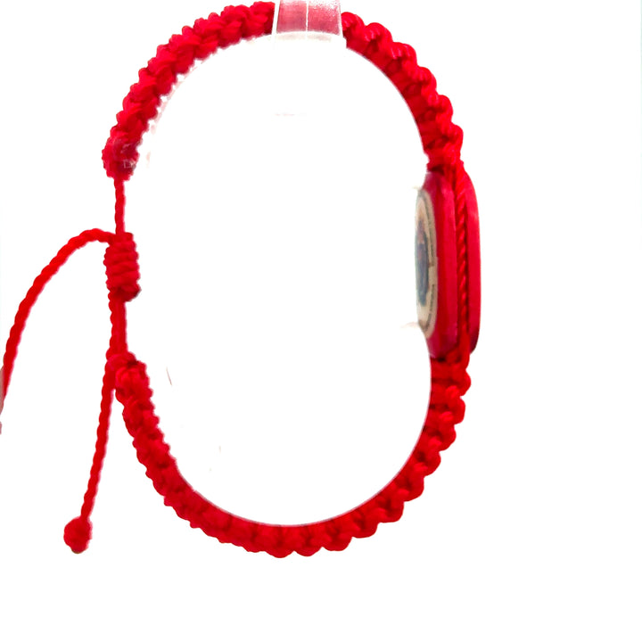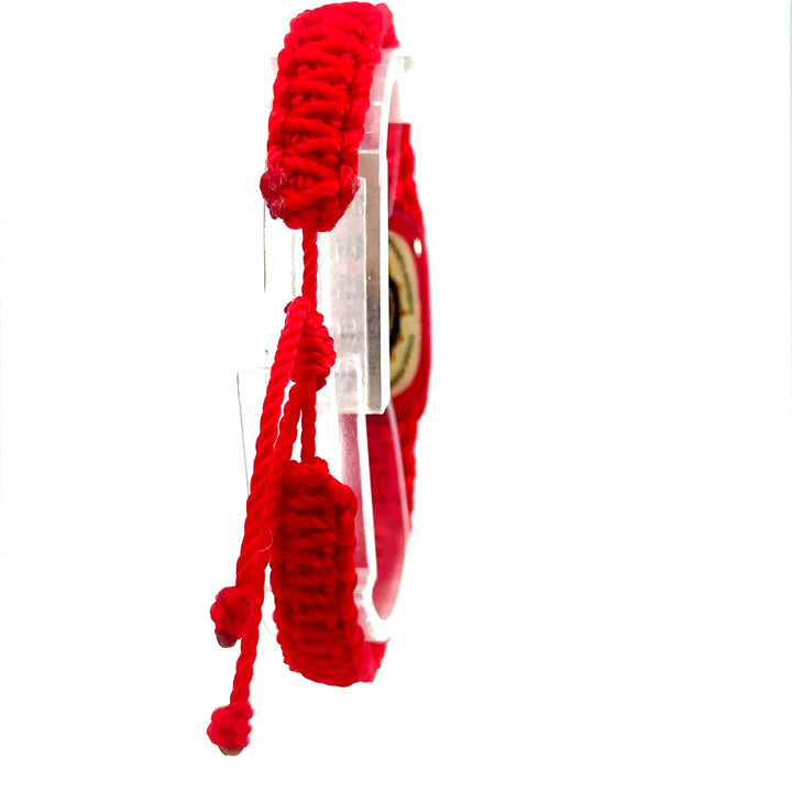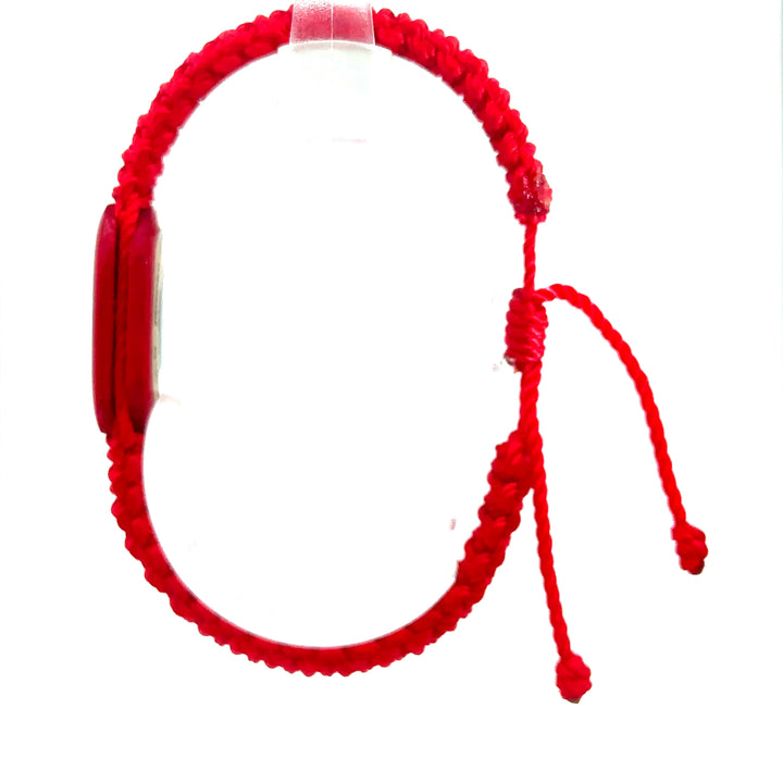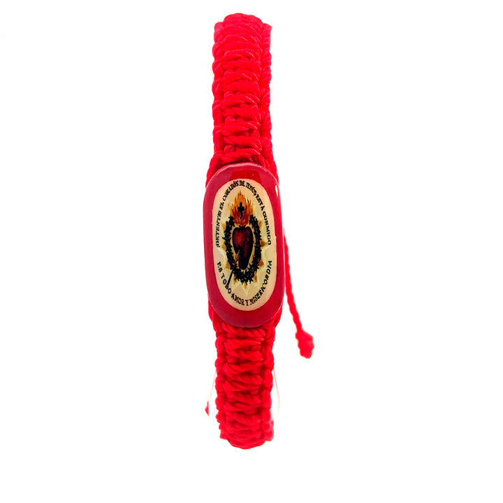 Sacred Heart of Jesus Bracelet Handmade Double Side - Reversible Color image of Sacred Heart of Jesus Wood charm Red color knotted rope Adjustable Made in Mexico Pulsera de Sagrado Corazon...