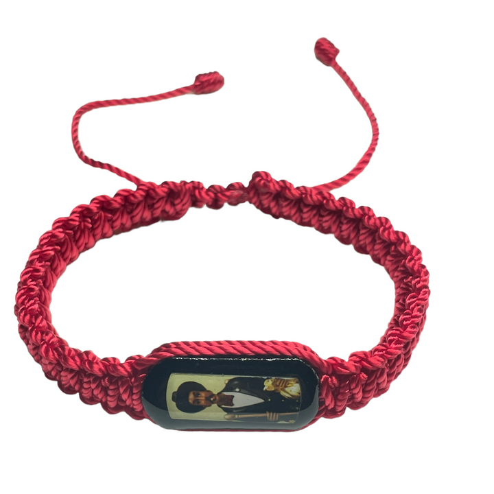 San Simon Knotted Rope Bracelet Wood charm with San Simon image Hand made in Mexico Adjustable one size fits all Red color knotted rope San Simon Pulsera Medalla de madera con la imagen...