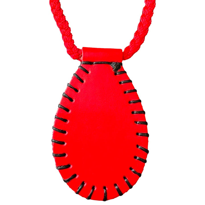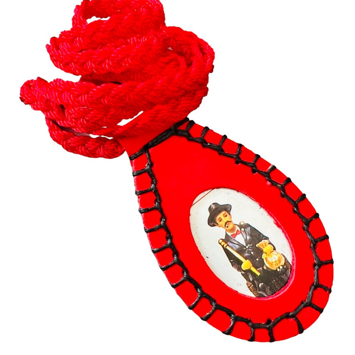 San Simon Scapular Handmade Leather Pendant Red Leather Color Made with Red Knotted Rope Pendant has color image of San Simon Necklace measures 26" Pendant measures 3" Escapulario de San Simon ...