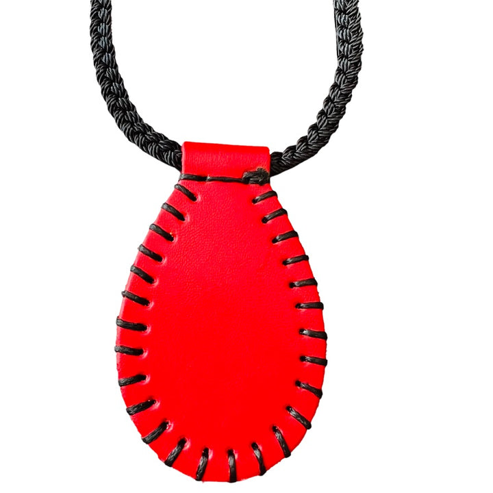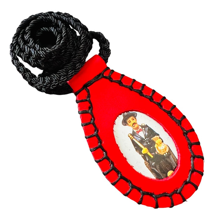 San Simon Scapular Handmade Leather Pendant Red Leather Color Made with Black Knotted Rope Pendant has color image of San Simon Necklace measures 26" Pendant measures 3" Escapulario de San Simon ...