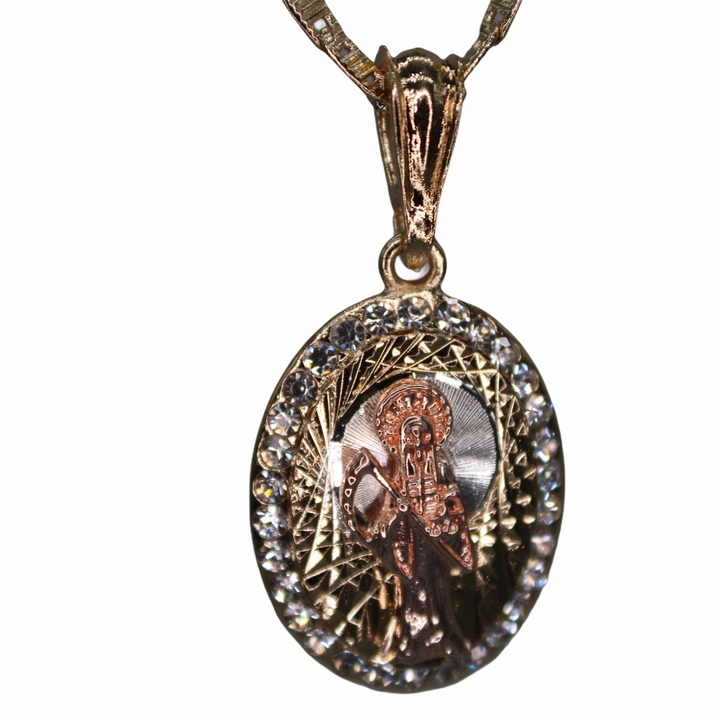 Santa Muerte Santa Muerte Pendant - Three Tone with White Shinny Stones Pendant and Necklace are 24K Gold Filled Pendant Measures 1 3/4" Necklace Measures 22" Santa Muerte Medalla de Santa Muerte - Tres...