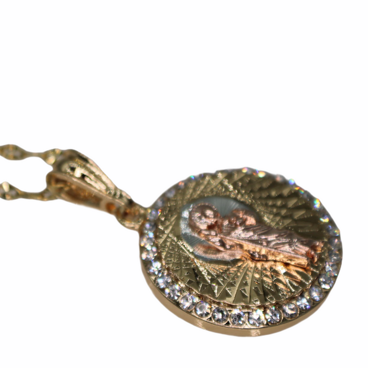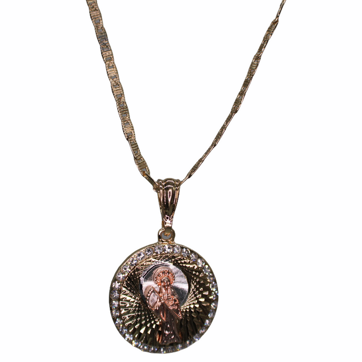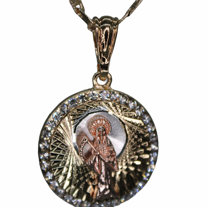 Santa Muerte Santa Muerte Pendant - Three Tone with White Shinny Stones Pendant and Necklace are 24K Gold Filled Pendant Measures 1 5/8" Necklace Measures 22" Santa Muerte Medalla de Santa Muerte - Tres...