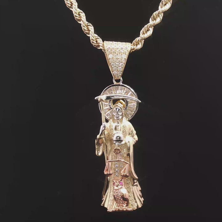 Santa Muerte 3D Three Tone Pendant Material: 10K Gold Stones: CZ Weight: Approximately 9 grams Size: Approximately 2 1/4" Tall with bail Optional 22" Rope Chains, Weights Approximately 7 grams...