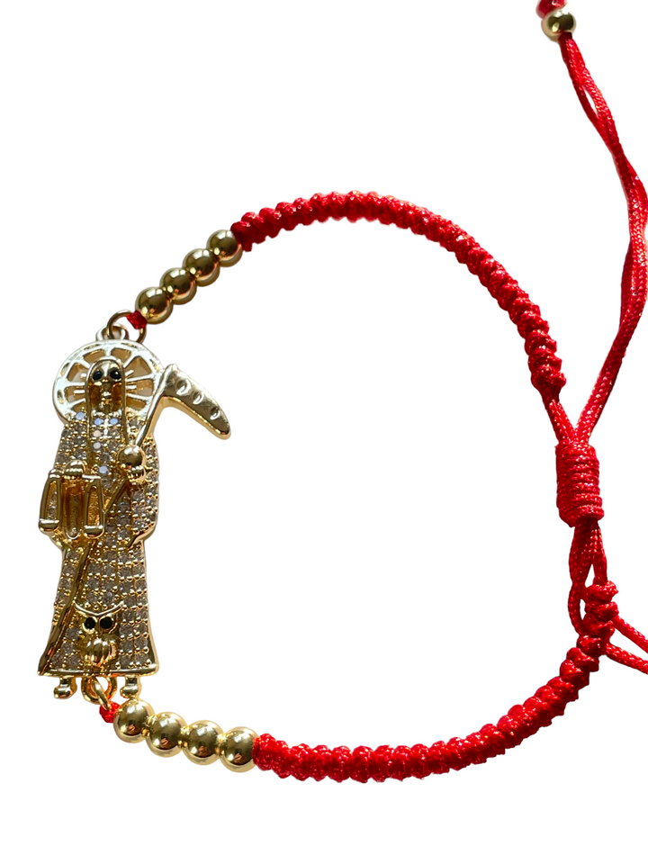 Santa Muerte Bracelet Knotted Red Rope Santa Muerte Pendant is 24K Gold Filled White CZ Stones Pendant Measures 38mm Bracelet is Adjustable - One Size Fits All Pulsera de La Santa Muerte...