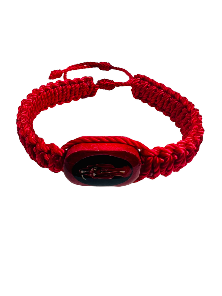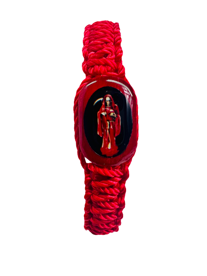 Santa Muerte Knotted Rope Bracelet Wood charm with Santa Muerte image in red Hand made in Mexico Adjustable one size fits all Red color knotted rope Santa Muerte Pulsera Medalla de madera...
