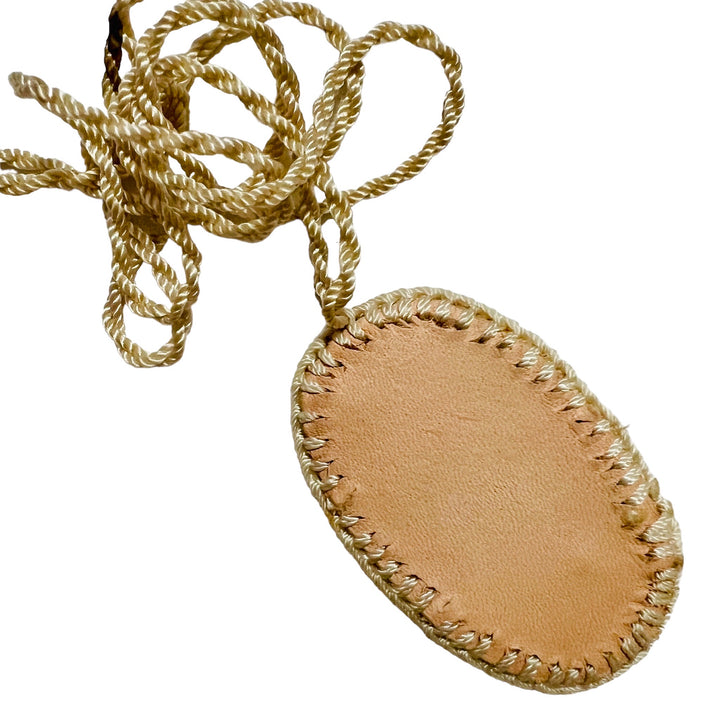 Santa Muerte (7 Powers) Scapular Necklace Handmade Leather Pendant Brown color with Nude color trim Nylon Knotted Cream Color Rope Necklace Necklace measures 26” - Adjustable Pendant has color image of...