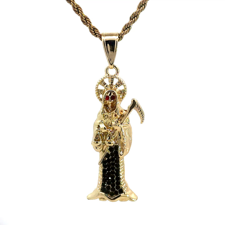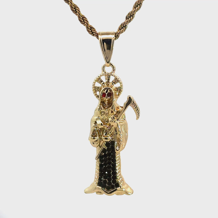 Santa Muerte Necklace Santa Muerte Pendant has Black color Stones Pendant is 24K Gold Filled Rope Necklace is 24K Gold Filled over Stainless Steel Pendant Measures 2" Necklace Measures 24" Cadena...