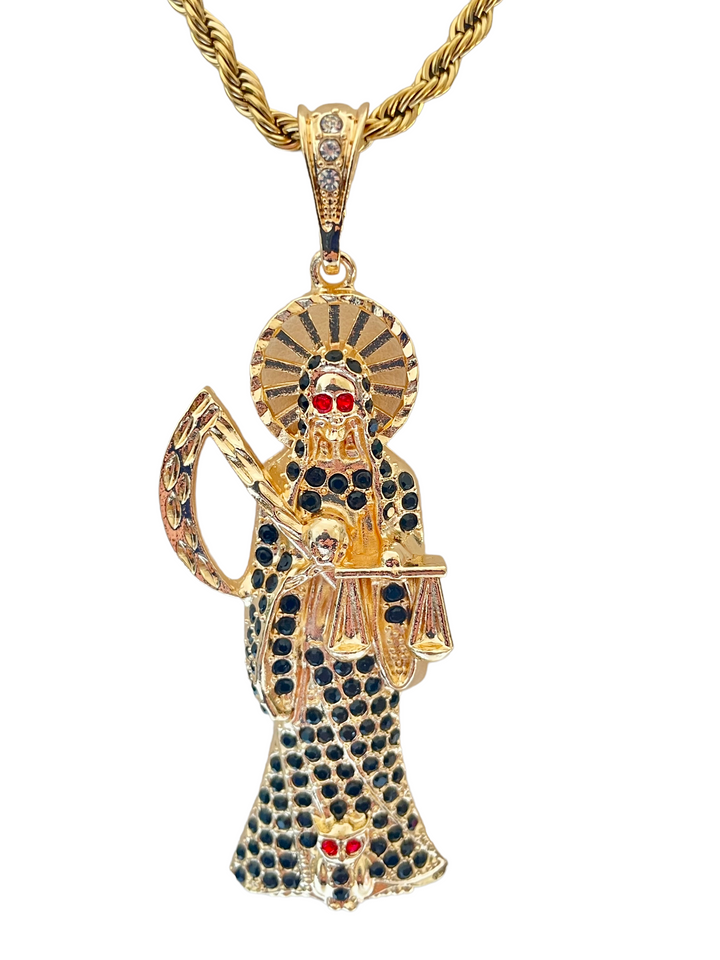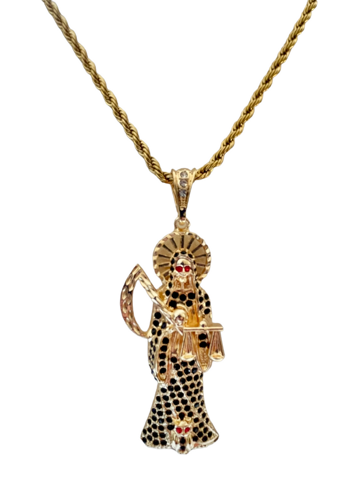 Black Santa Muerte Santa Muerte Pendant has Black CZ Stones. Pendant is 24K Gold Filled Rope Necklace is 24K Gold Filled over Stainless Steel Pendant Measures 90mm Tall Necklace Measures 26" 4...