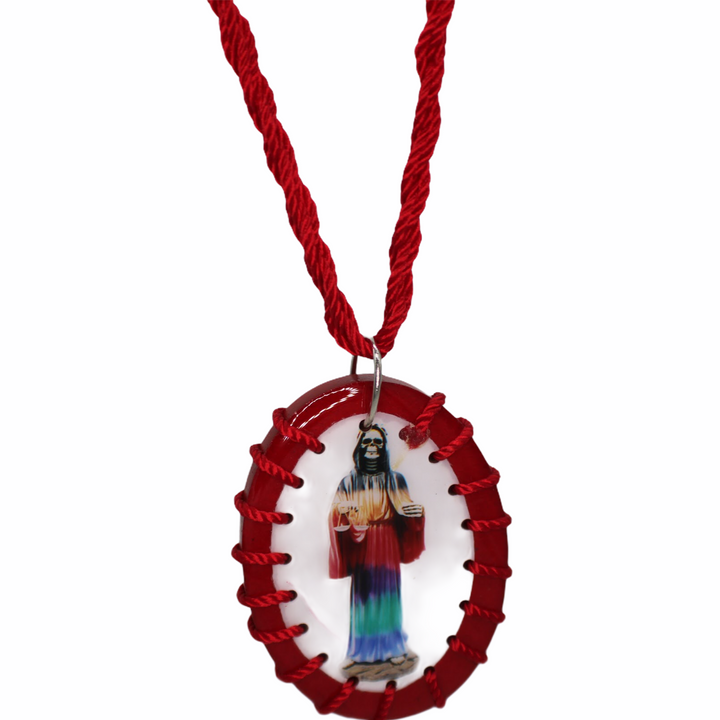 Santa Muerte Oval Scapular Handmade Wood Pendant Red Color - 7 Powers Made with Nylon Knotted Rope Adjustable Pendant has color image of Santa Muerte on both sides Pendant measures 2 1/4" Escapulario de Santa...