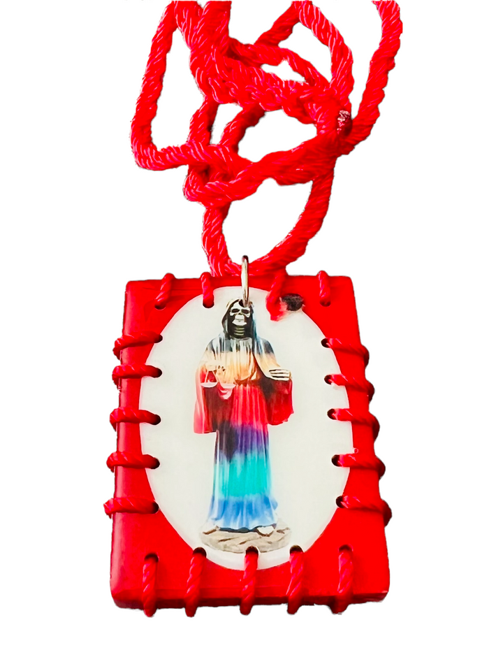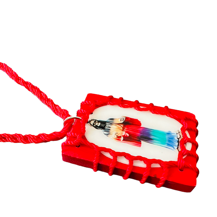 Santa Muerte Scapular Handmade Wood Pendant Red Color - 7 Powers Made with Nylon Knotted Rope Adjustable Pendant has color image of Santa Muerte on both sides Pendant measures 1 1/4" by...