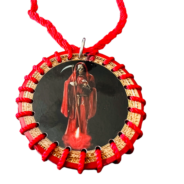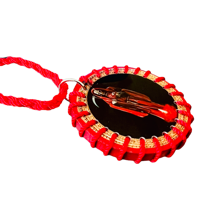 Santa Muerte Scapular Handmade Round Wood Pendant Black and Red Color Made with Nylon Knotted Rope Adjustable Pendant has color image of Santa Muerte on both sides Pendant measures 2" Escapulario...