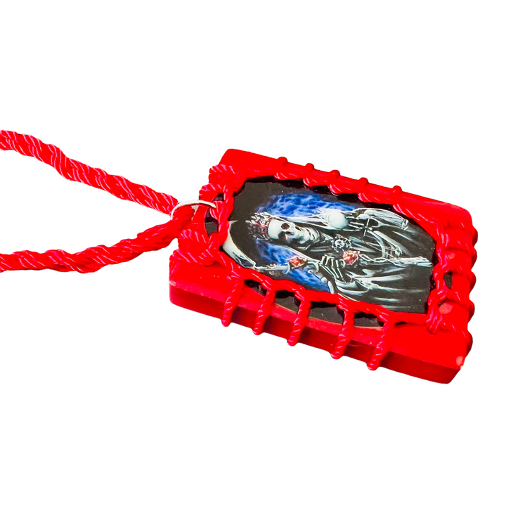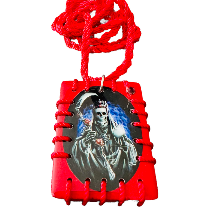 Santa Muerte Scapular Handmade Wood Pendant Red Color - Made with Nylon Knotted Rope Adjustable Pendant has color image of Santa Muerte on both sides Pendant measures 1 1/4" by 2" Escapulario...