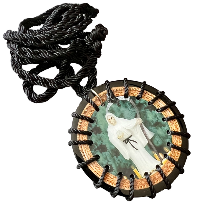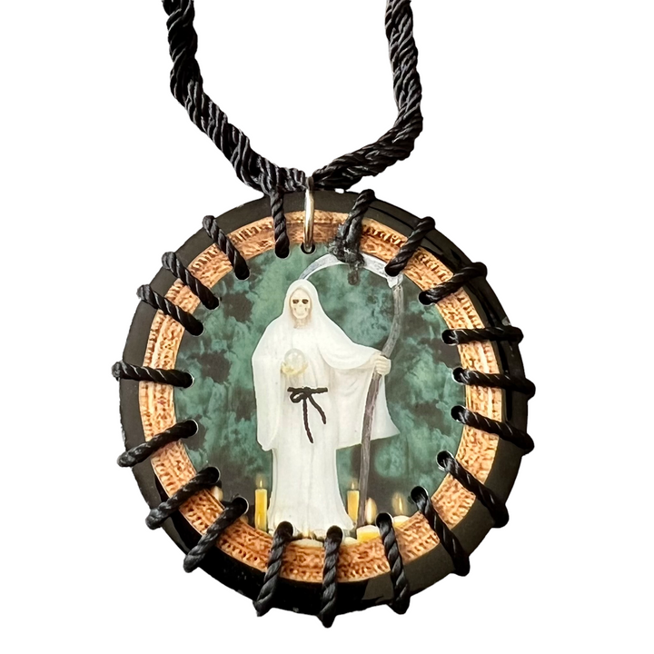 Santa Muerte Scapular Necklace Handmade Round Wood Pendant Black Color Made with Nylon Knotted Rope Necklace measures 26” Pendant has color image of Santa Muerte on both sides Pendant measures 2"...