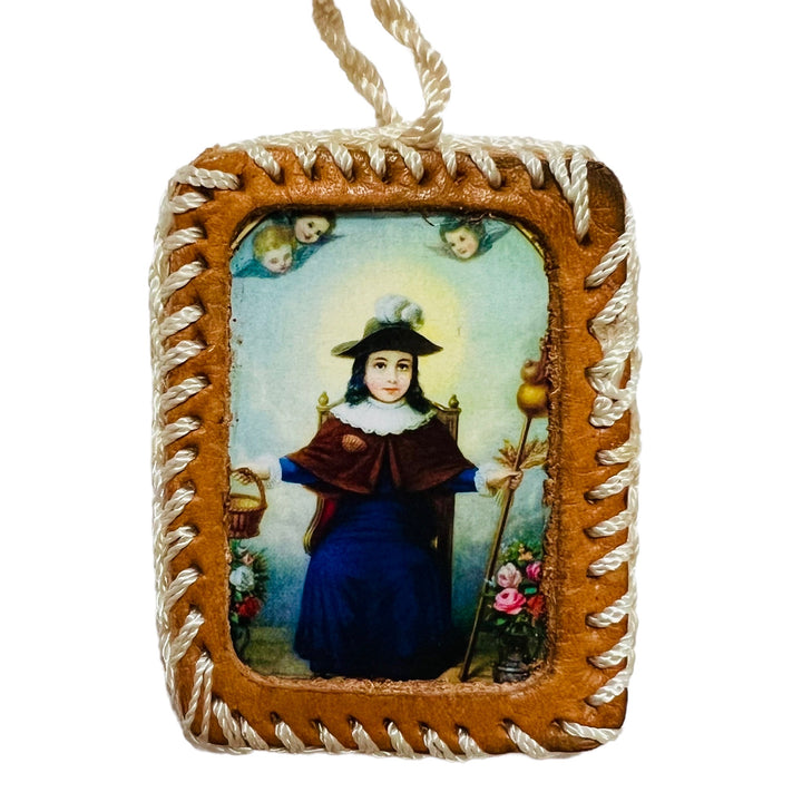 Holy Child of Atochas Scapular Necklace Handmade Leather Pendant Leather with Cream Color Held with Cream Color Knotted Rope Necklace Pendant has color image of Holy Child of Atocha Necklace measures...