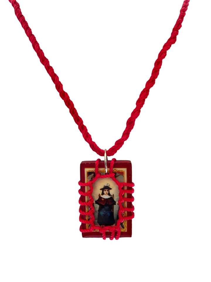 Santo Nino de Atocha Scapular Necklace Handmade Wood Pendant Red Color Made with Nylon Knotted Rope Adjustable Pendant has color image of Santo Nino on both sides Pendant measures 1 1/8"...
