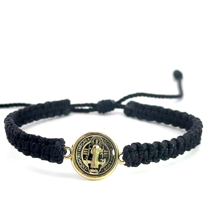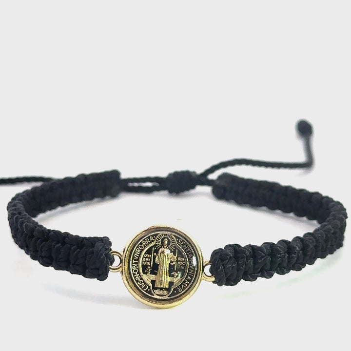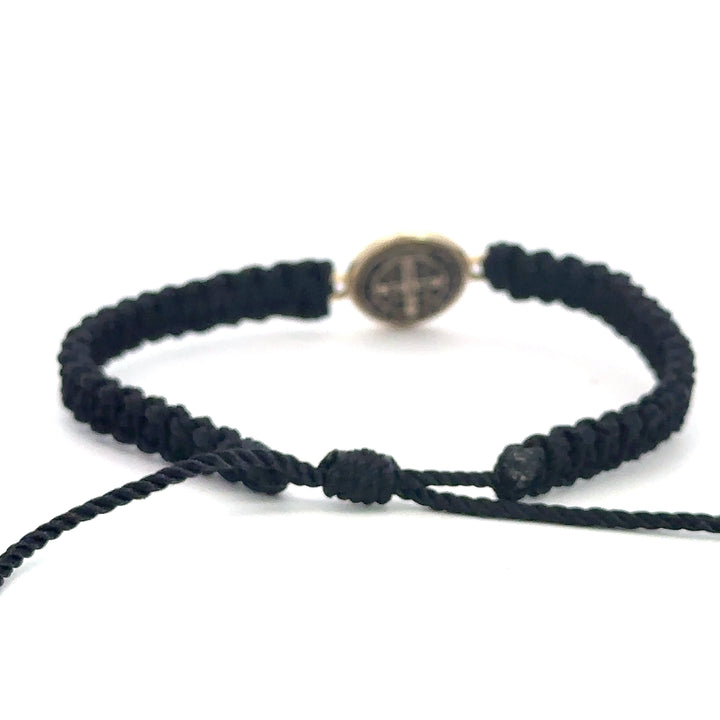 St Benedict Bracelet Handmade Small Metal Pendant with St Benedict Emblem Reversible Black Color Made with Nylon Knotted Rope Adjustable San Benito Pulsera Hecho a Mano Medalla de Metal Pequeno con Emblema de San...