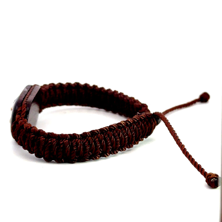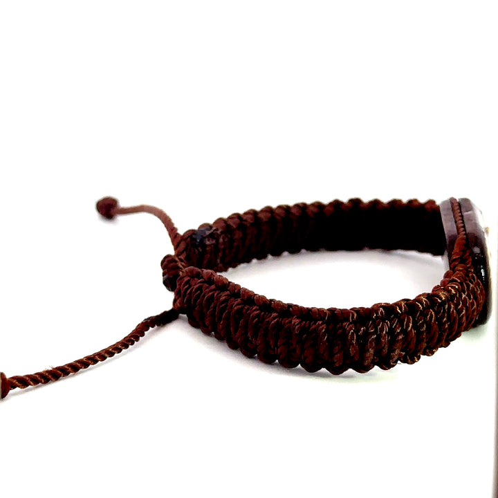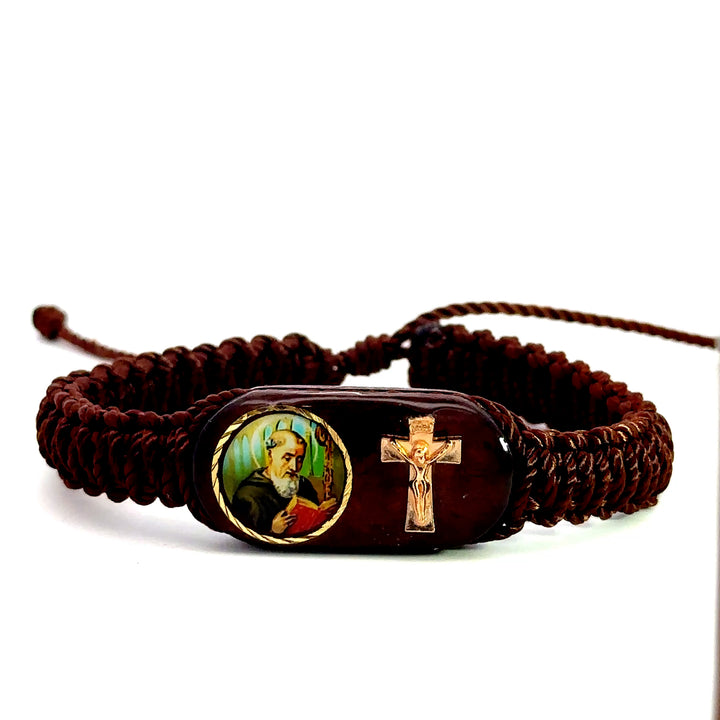 St Benedict Bracelet Handmade St Benedict color Image with Gold Plated Cross on top of Wood Charm Brown Color Knotted Rope Adjustable Made in Mexico San Benito Pulsera Hecho a Mano...