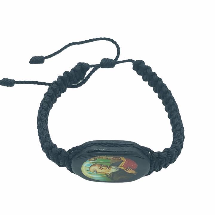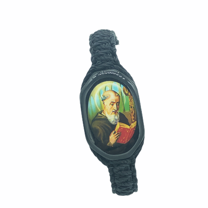 St Benedict Bracelet Handmade Wood Charm Black Color Made with Nylon Knotted Rope Adjustable Pendant has color image of St Benedict on both sides San Benito Pulsera Hecho a Mano Medalla de Madera Color Negro...