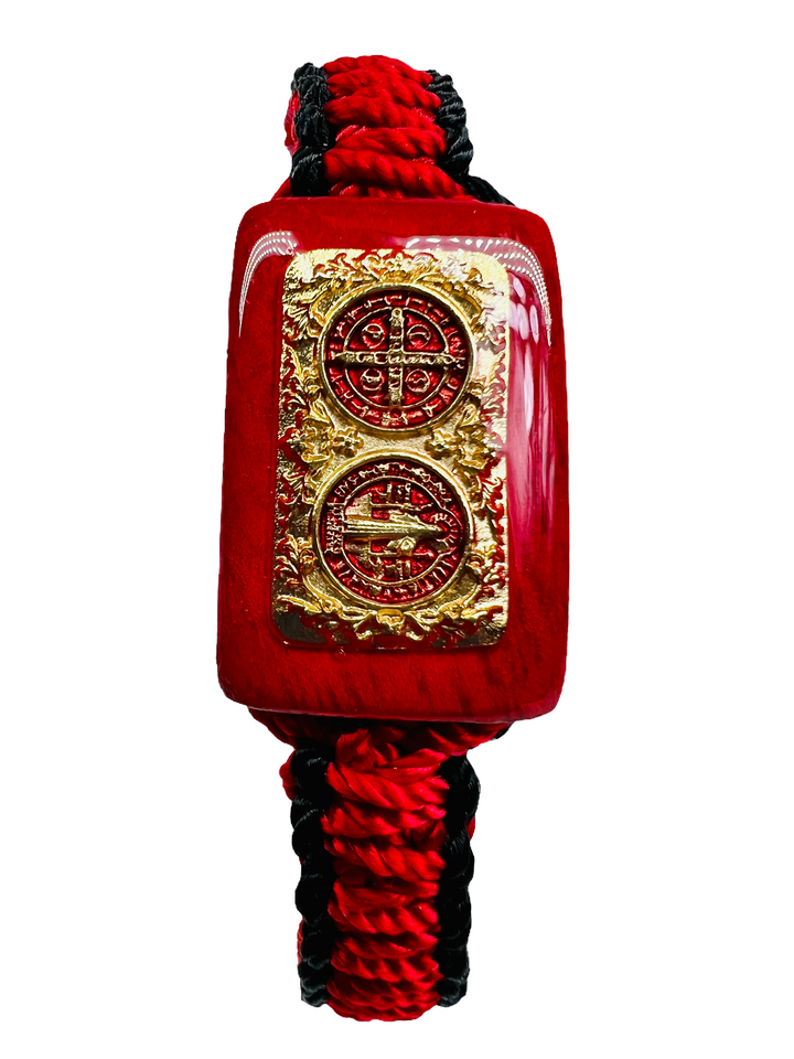 St Benedict Bracelet Handmade Wood Charm with Gold Filled Emblem Red and Black Color Made with Nylon Knotted Rope Adjustable Pendant has St Benedict Emblem San Benito Pulsera Hecho a Mano Medalla de Madera con...