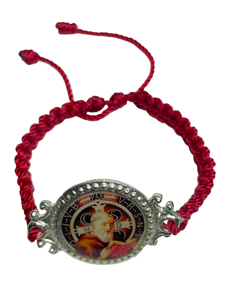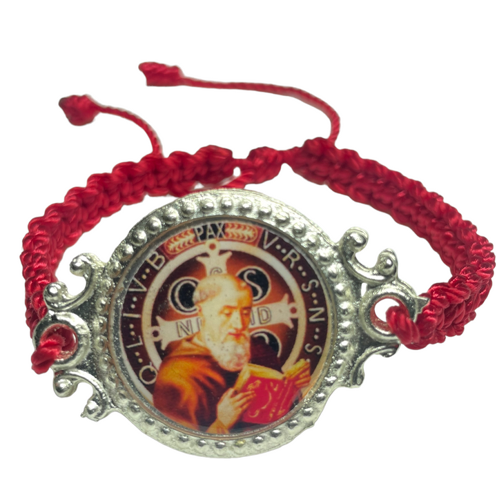 St Benedict Knotted Rope Bracelet Silver tone pendant with St Benedict color image on both sides Hand made in Mexico Adjustable one size fits all Red color knotted rope San Benito Pulsera Medalla de metal en tono...