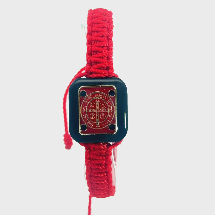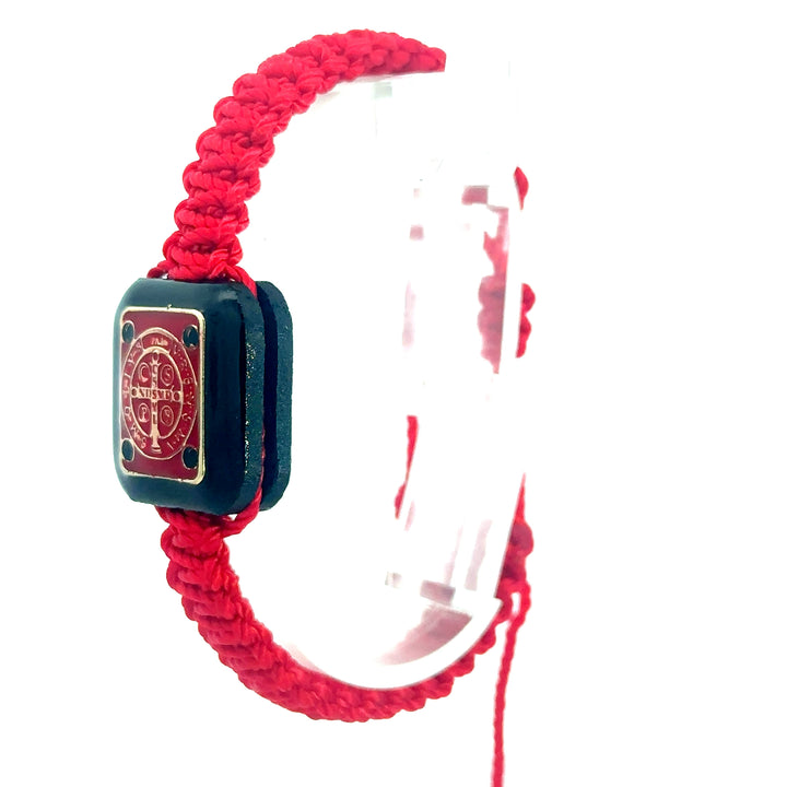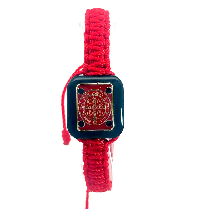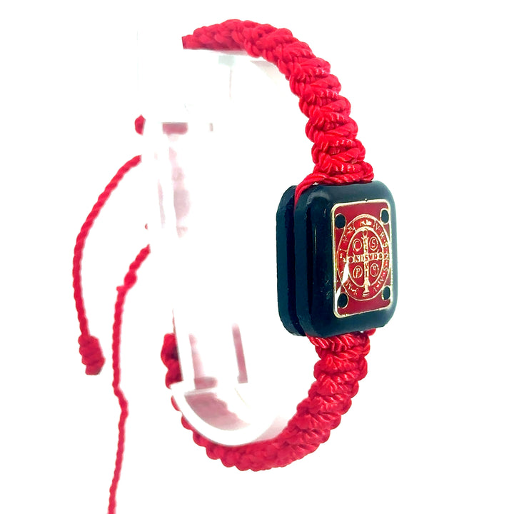 St Benedict Bracelet Handmade St Benedict Gold Plated image on top a Wood Charm Red Color Knotted Rope Adjustable Made in Mexico San Benito Pulsera Hecho a Mano Tiene la imagen de...