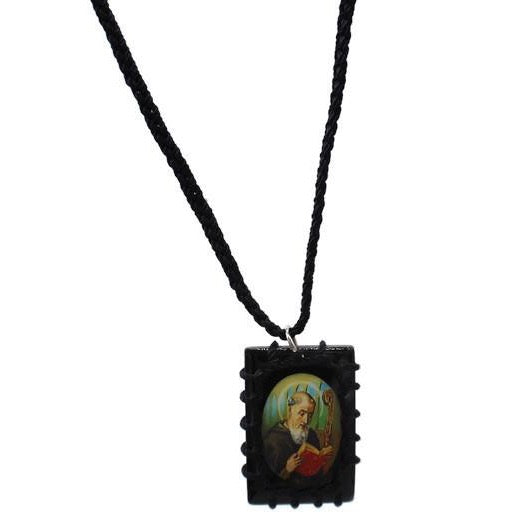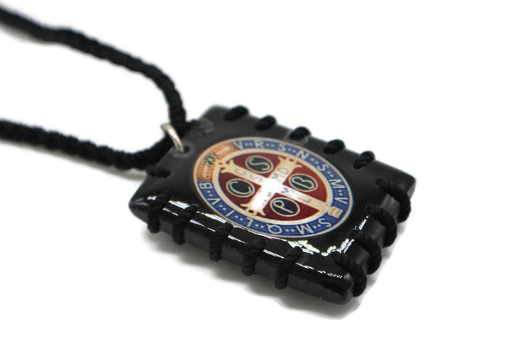 St Benedict Scapular Handmade Wood Pendant Black Color Made with Nylon Knotted Rope Adjustable Pendant has color image of St Benedict on both sides Pendant measures 1 1/8" by 1 3/4" Escapulario de San...