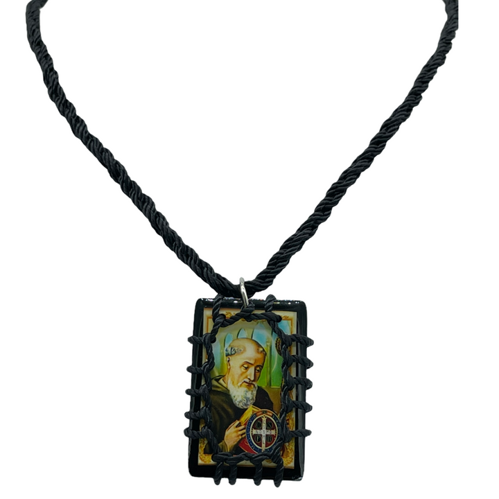 St Benedict Scapular Handmade Wood Pendant Black Color Made with Nylon Knotted Rope Adjustable Pendant has color image of St Benedict on both sides Pendant measures 1" by 1 5/8" Escapulario de San Benito...
