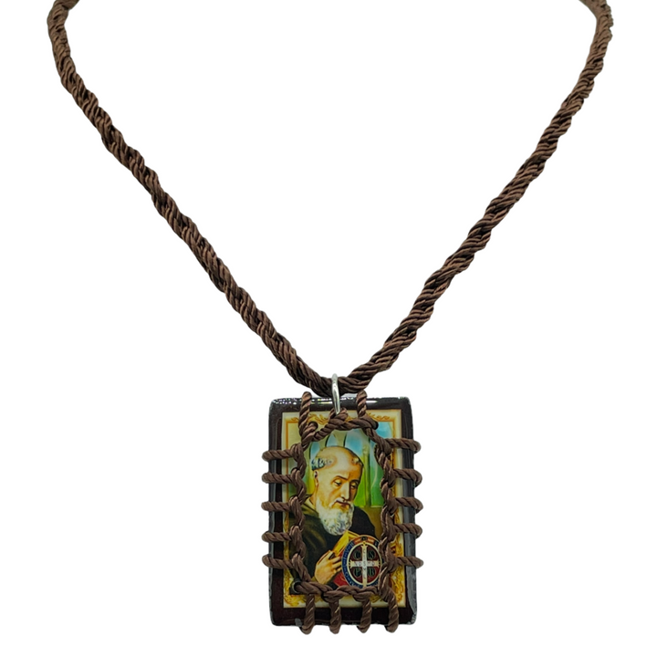 St Benedict Scapular Handmade Wood Pendant Brown Color Made with Nylon Knotted Rope Adjustable Pendant has color image of St Benedict on both sides Pendant measures 1" by 1 5/8" Escapulario de San Benito...
