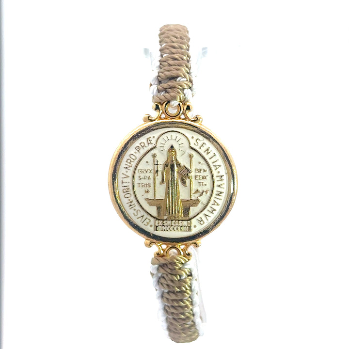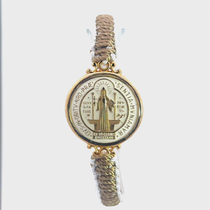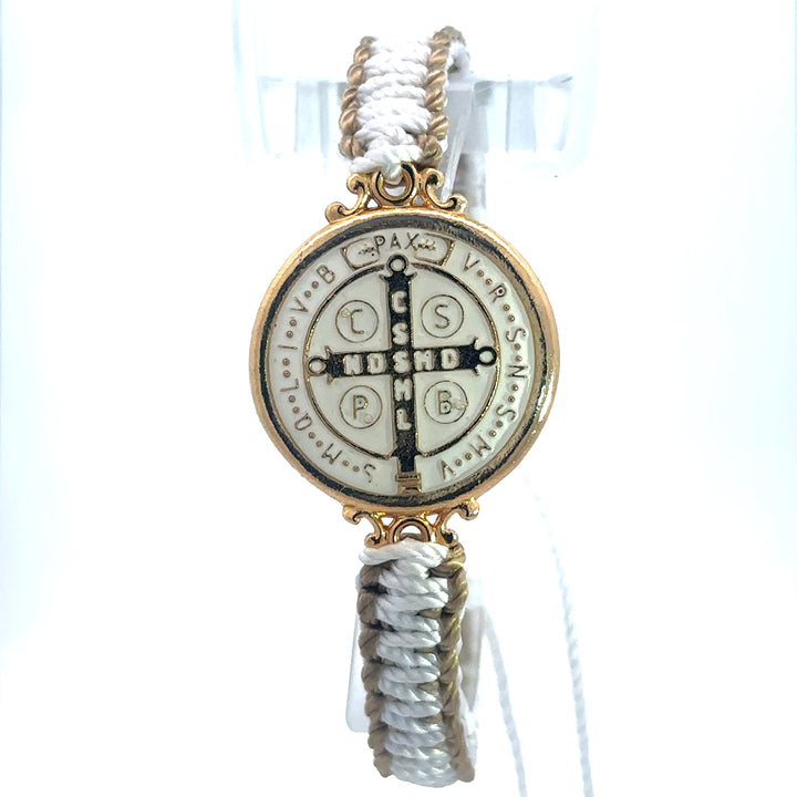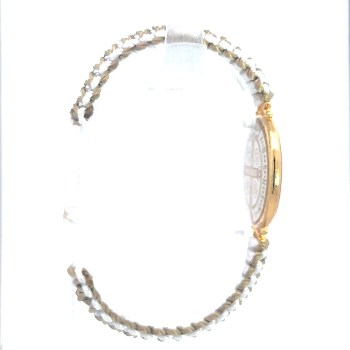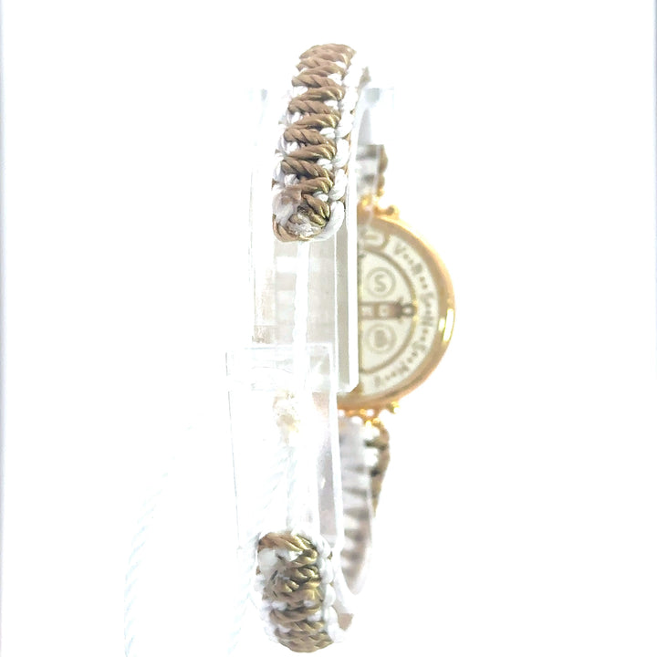 St Benedict Bracelet Handmade Metal Pendant with St Benedict Emblem Reversible White and Gold Color Made with Nylon Knotted Rope Adjustable San Benito Pulsera Hecho a Mano Medalla de Metal con Emblema de San...