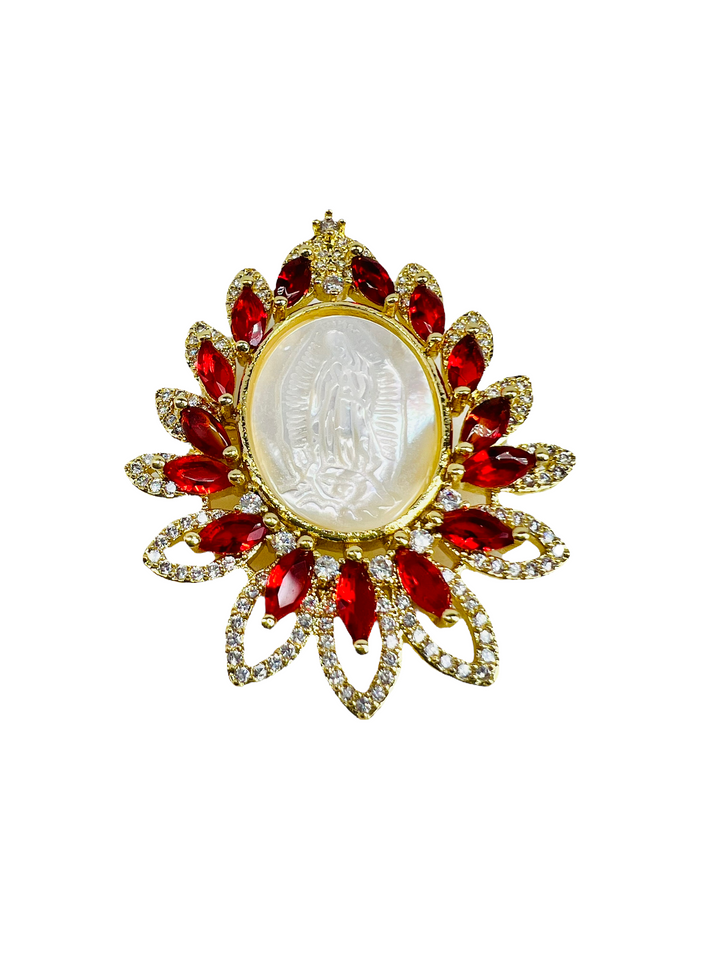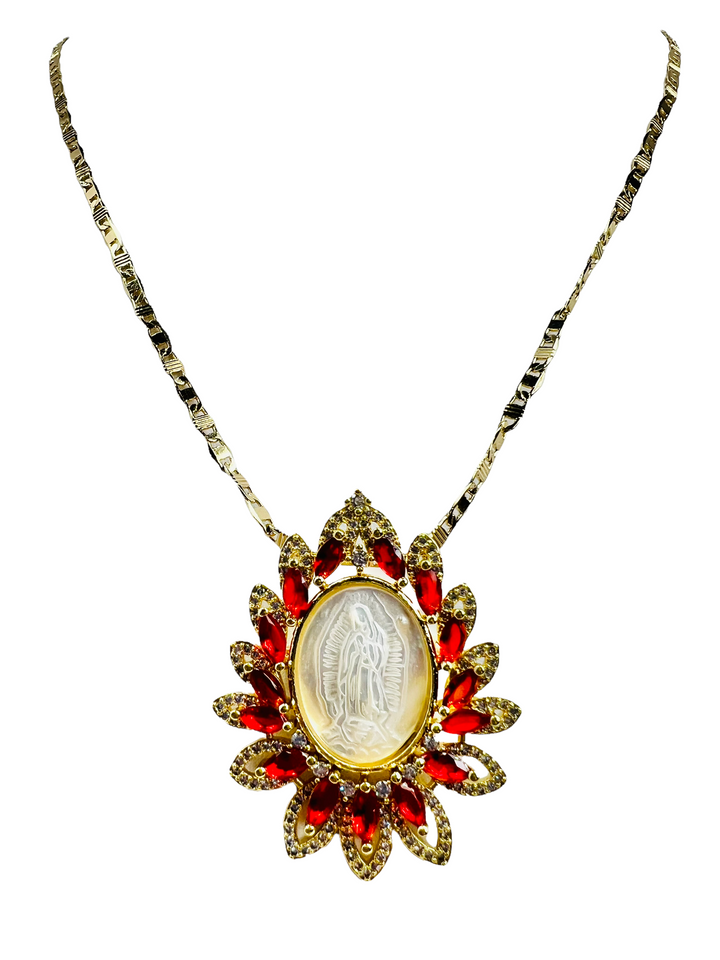Our Lady of Guadalupe Pendant with Necklace & Brouche Our Lady of Guadalupe Pendant can also be used as a Brouche The Pendant has Red and White stones around the perimeter....