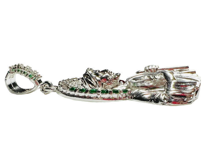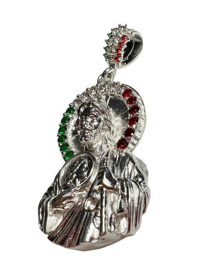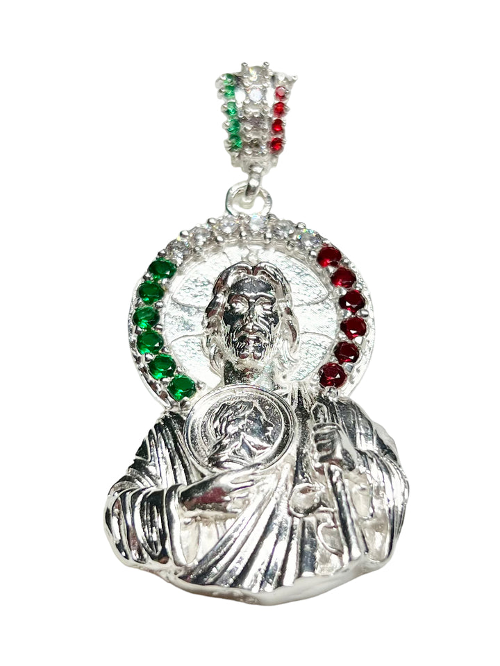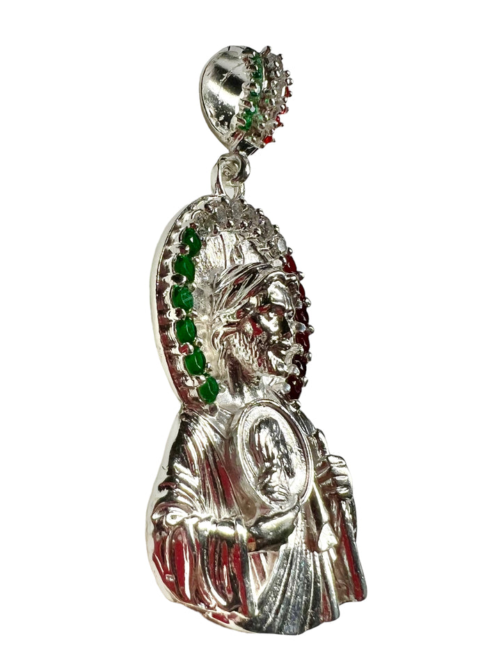 St Jude Sterling Silver .925 2D Pendant Has Green, Red and White Stones Option to purchase only pendant or with cuban style chain Pendant Measures 65 mm tall (2 1/2" tall)...