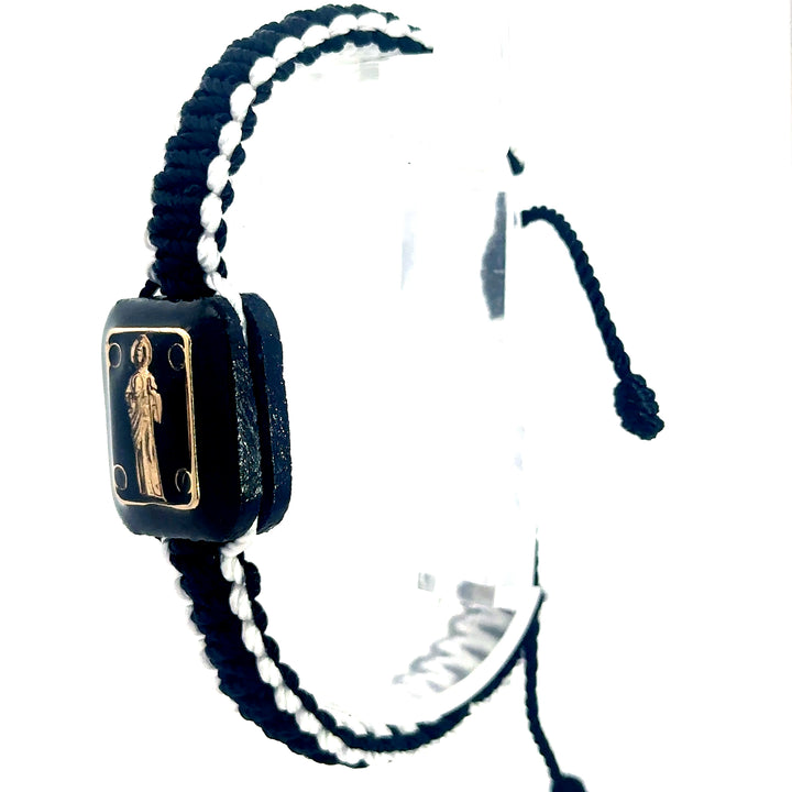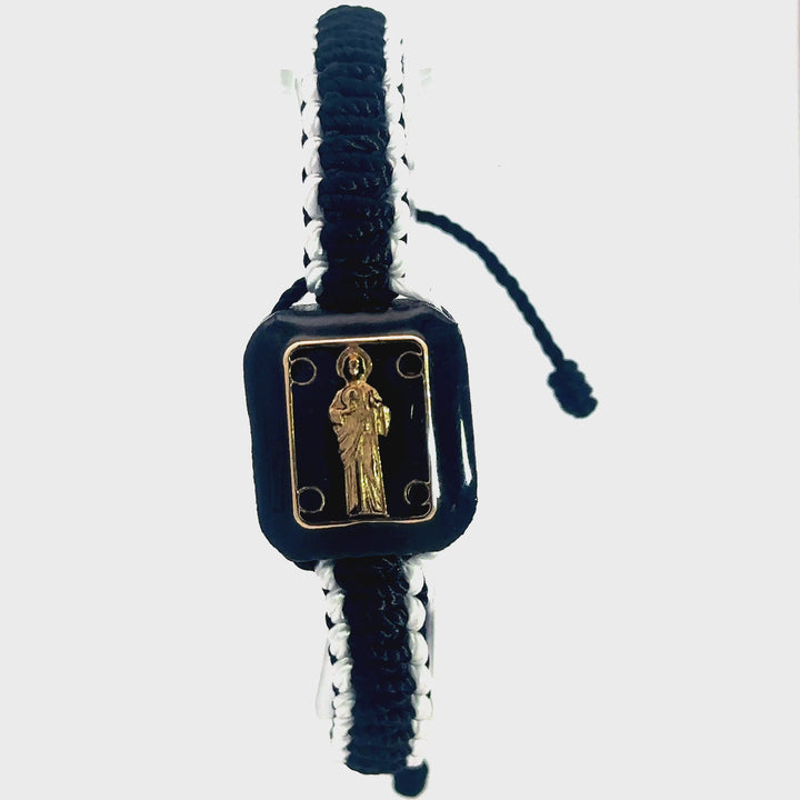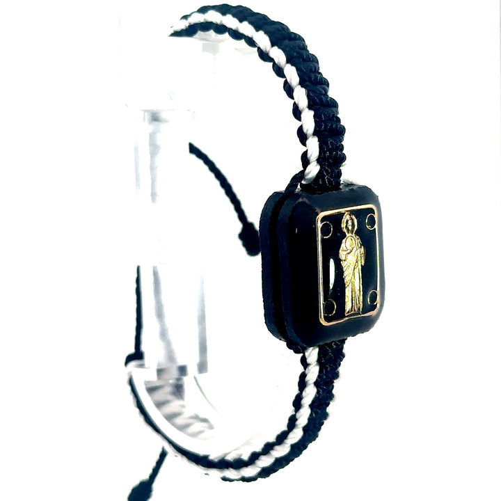 St Jude Bracelet Handmade St Jude Gold Plated image on top a Wood Charm Black and White Color Knotted Rope Adjustable Made in Mexico San Judas Pulsera Hecho a Mano Tiene la...
