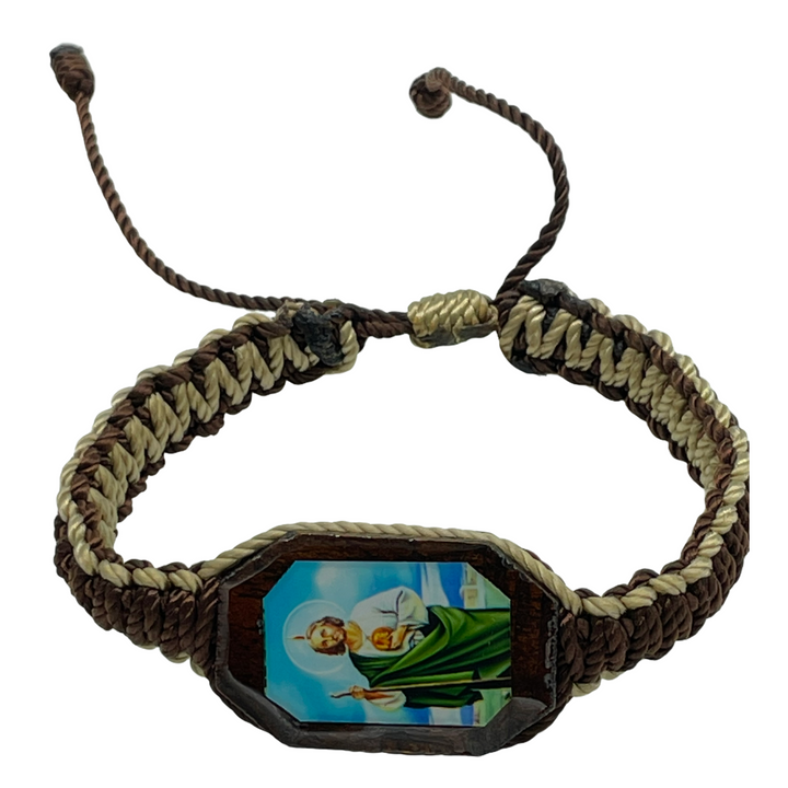 St Jude Bracelet Handmade Double Side Has Our St Jude Color Image on Front and Back Wood Charm Brown and Gold Color Knotted Rope Adjustable Made in Mexico San Judas Pulsera Hecho a Mano...