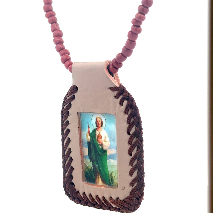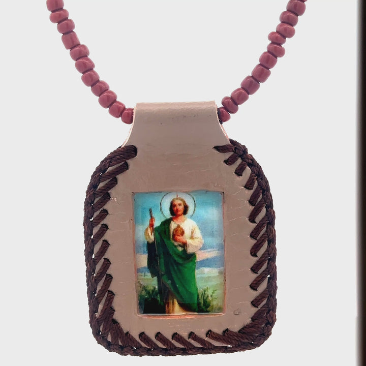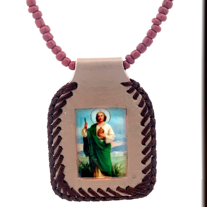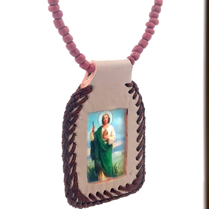 St Jude Leather Necklace Handmade Leather Pendant Tan Color Pendant with Brown Rope Necklace is Made with Brown Color Beads Pendant has color image of St Jude Necklace Measures - 26" Pendant measures...