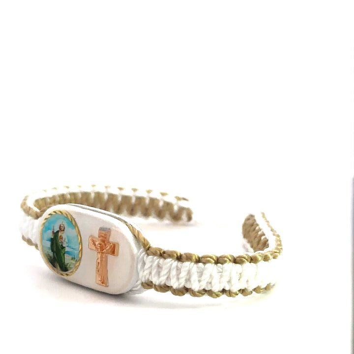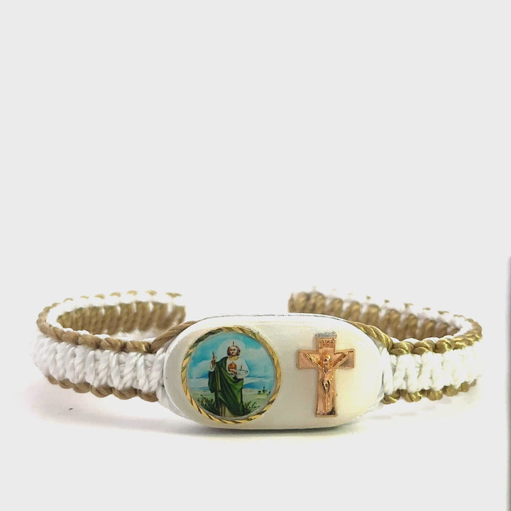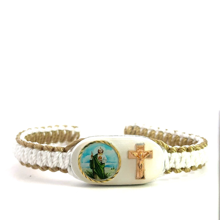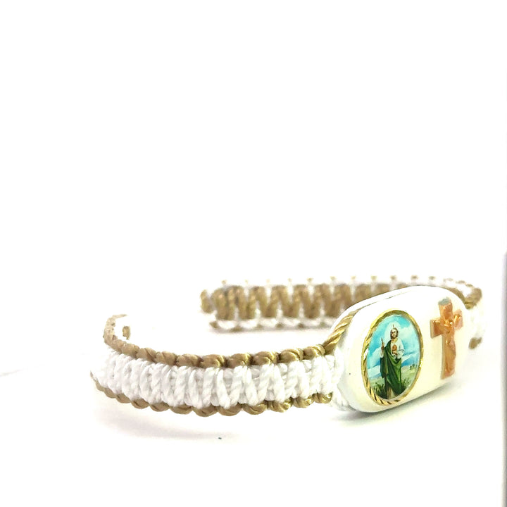 St Jude Bracelet Handmade St Jude color Image with Gold Plated Cross on top of Wood Charm White and Gold Color Knotted Rope Adjustable Made in Mexico San Judas Pulsera Hecho a Mano...