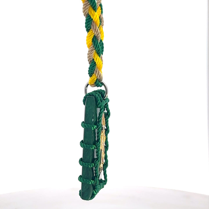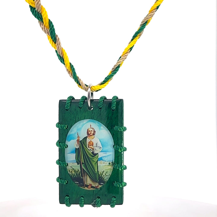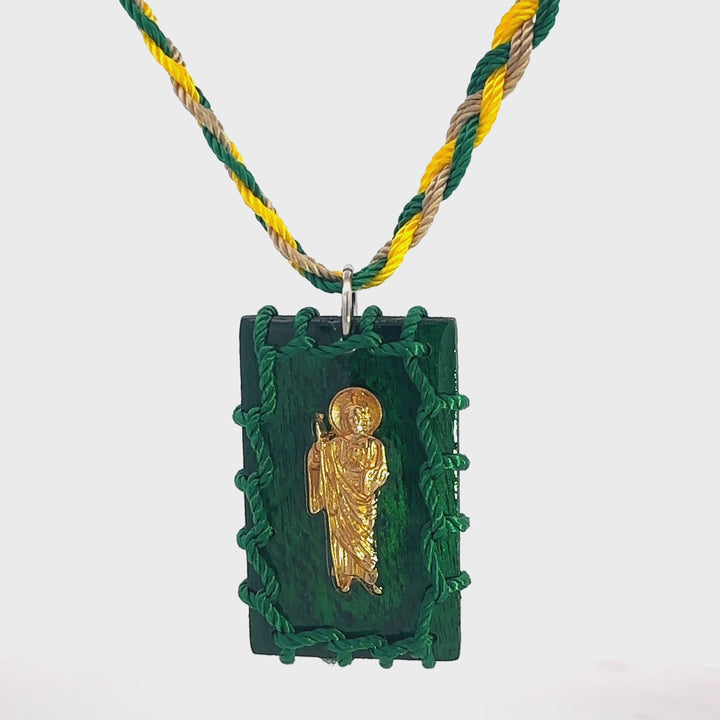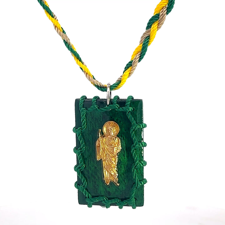 St Jude Reversible Scapular Necklace Reversible Green wood pendant with St Jude image on one side and Gold Plated charm on opposite side Handmade in Mexico Green, Yellow and Tan Knotted...