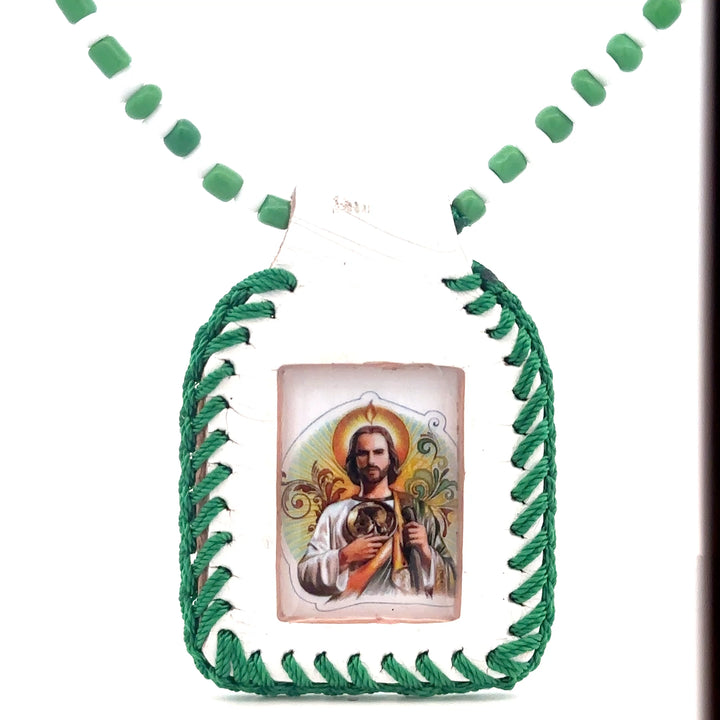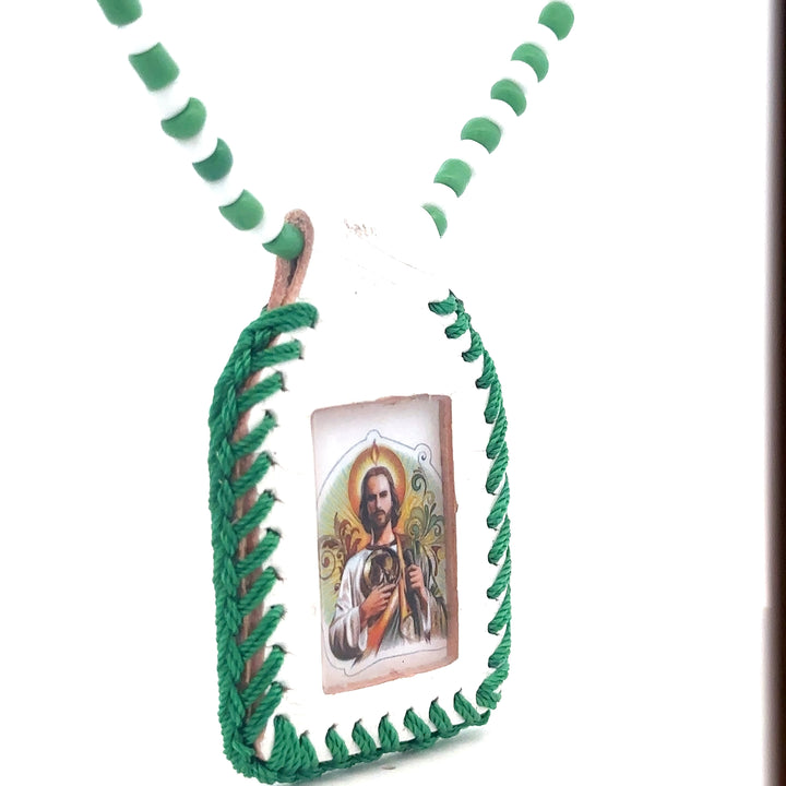 St Jude Leather Necklace Handmade Leather Pendant White Color Pendant with Green Rope Necklace is Made with White and Green Color Beads Pendant has color image of St Jude Necklace Measures - 26"...