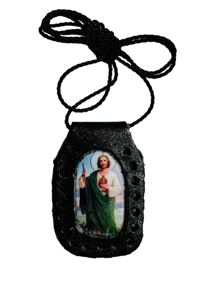 Reversible Scapular Necklace Handmade Leather Pendant Black color with brown rope Reversible St Jude Color Image on one side and Triple Image (Guadalupe, St Jude, Malverde) on the other side Necklace...