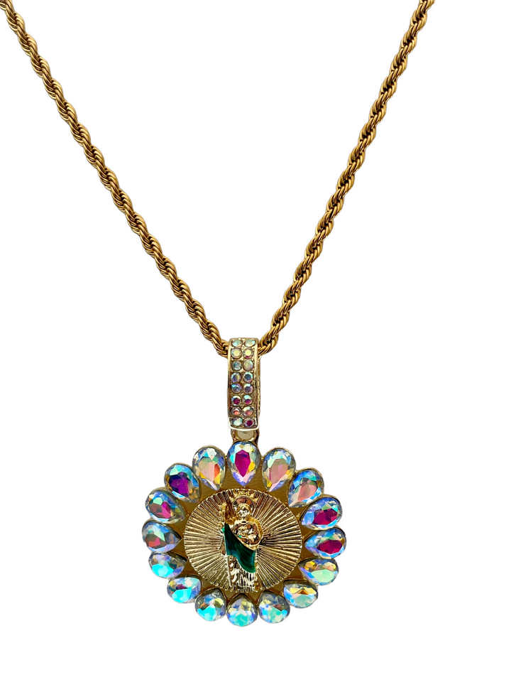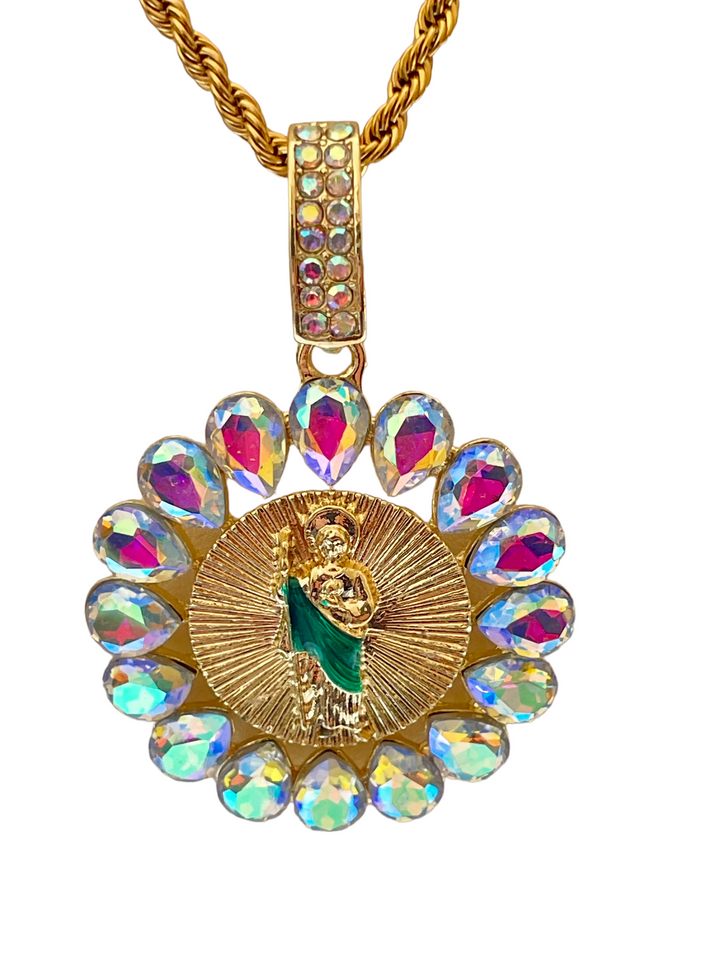 St Jude Necklace Round St Jude Pendant The pendant has color CZ stones Includes a 24" Gold Filled over Stainless Steel Rope Necklace Pendant is 24K Gold Filled Pendant Measures 58mm...