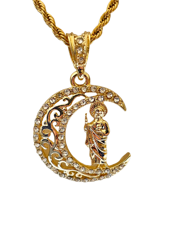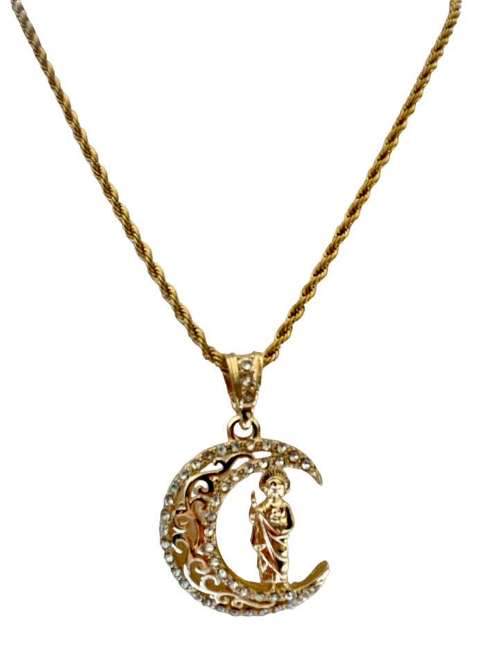 St Jude Moon Necklace St Jude in Moon Pendant Pendant has White CZ Stones Pendant is 24K Gold Filled Rope Necklace is 24K Gold Filled over Stainless Steel Pendant Measures 50mm Tall...