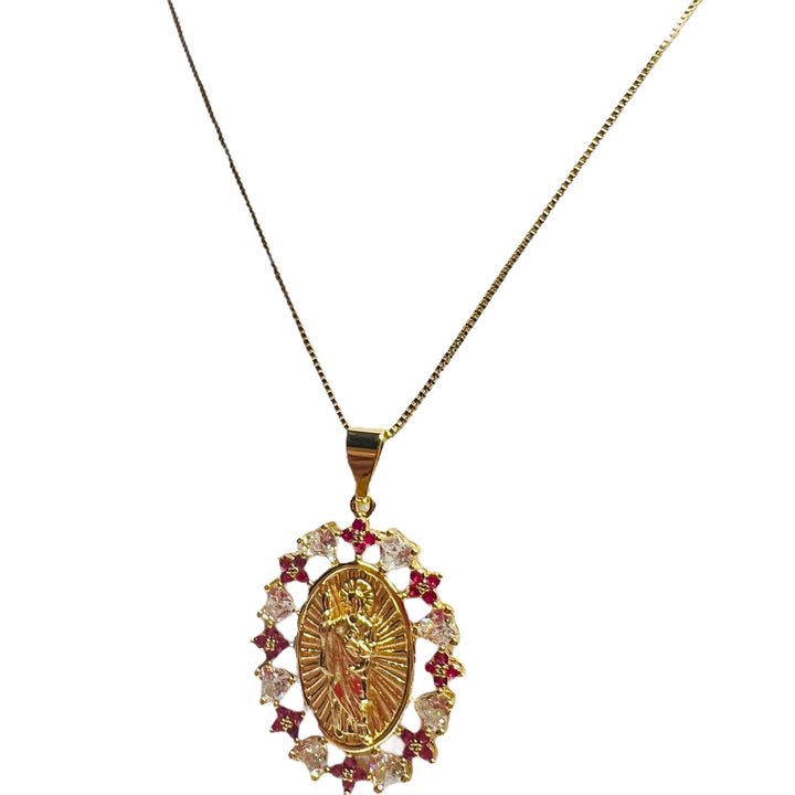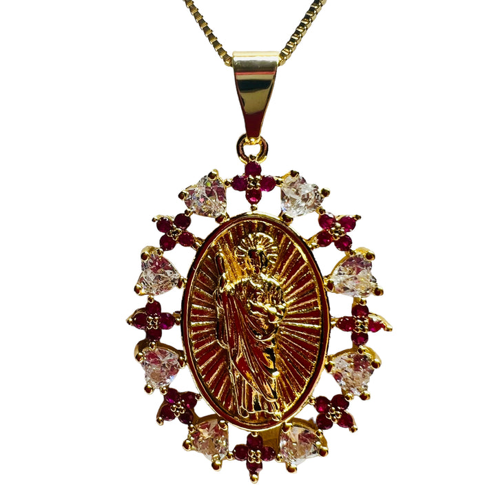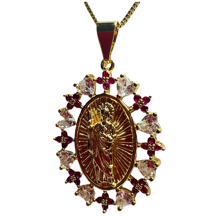 St Jude Pendant with Necklace St Jude Pendant Pink and White Stones Includes a 22" Gold Filled over Stainless Steel Necklace 24K Gold Filled Pendant Measures 2" Necklace Measures 22" Medalla de San Judas Con...