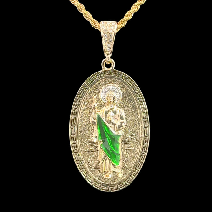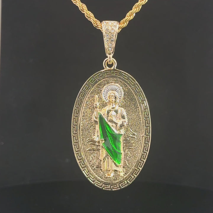 St Jude Large Oval Pendant with Chain Oval Pendant with St Jude image Includes Rope Chain 24K Gold Filled Pendant Measures (Including Bail) 2 3/4" Rope Chain Measures 26" San Judas...